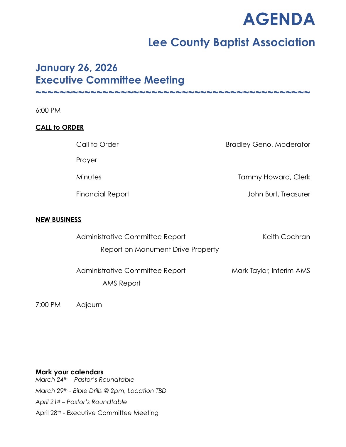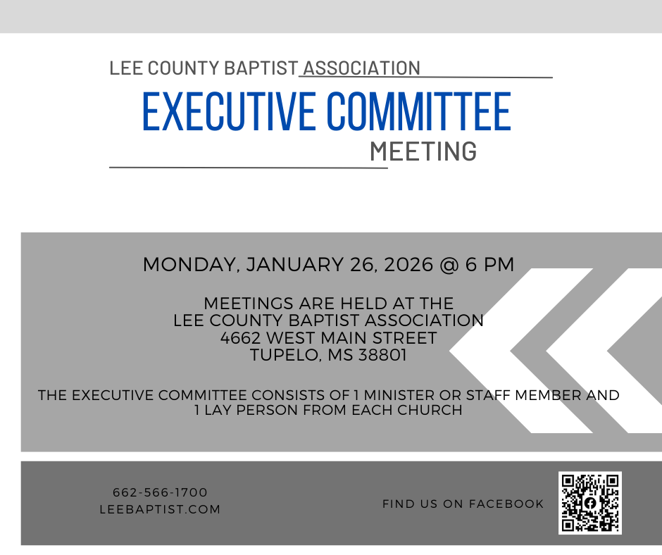 The Lee County Baptist Association has many upcoming gatherings, training opportunities and events for the NE Mississippi area. Please refer to this page to find out about upcoming meetings, events and other church related information. For more information on an event call us, 662.566.1700.